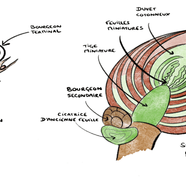 Ce qu’il faut avoir en tête à partir de la, c’est que dans un bourgeon il n’y a pas une « simple » feuille ou un fruit, mais une unité de croissance dite architecturale. C’est donc à partir du bourgeon que la plante va se développer en créant de la matière « par dessus » et non « par en dessous » comme un ongle de la main ou de l’herbe si l’on veut rester dans le domaine du végétal.